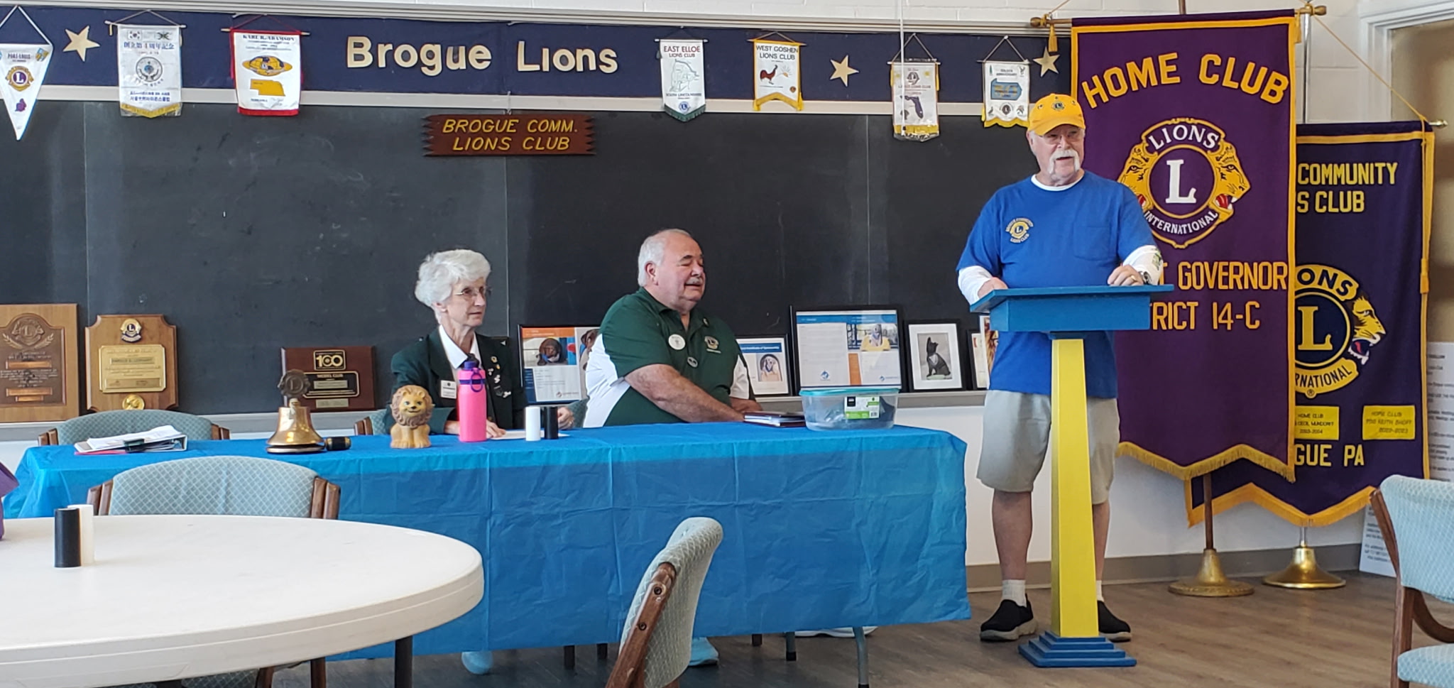 Past District Governor Kieth (right) introduces 1st Vice District Governor Patti (left) who introduced District Governor Doug (center) during his visitation to his home Lions Club of the Brogue Lions Club on Thursday evening (August 21).