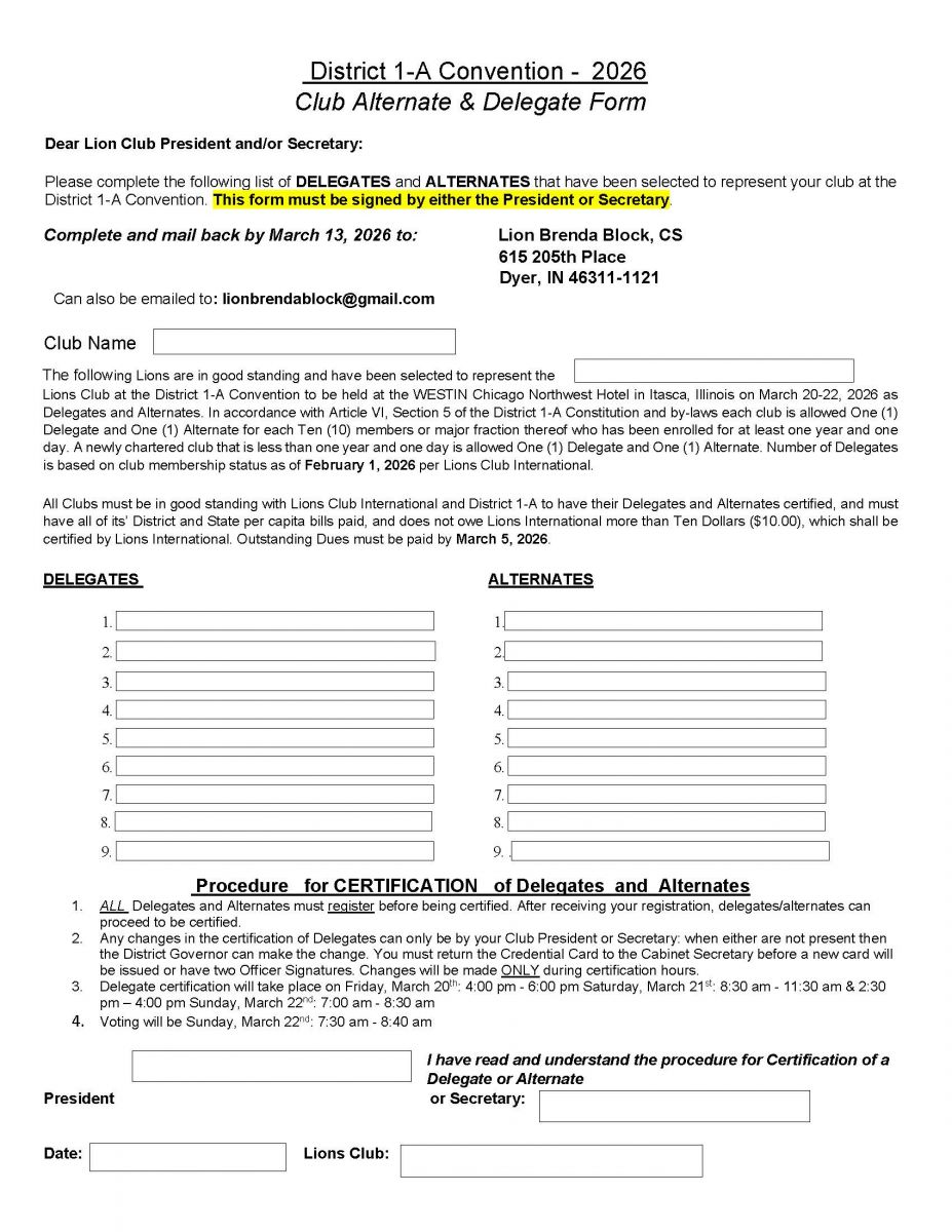 Please complete the form above listing the DELEGATES and ALTERNATES that have been selected to represent your club at the District 1-A Convention. This form must be signed by either the Club President or the Club Secretary.