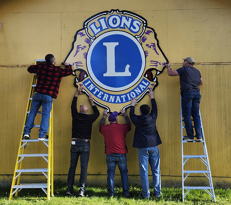 Members reinstall Yachats Lions Hall newly refurbished sign