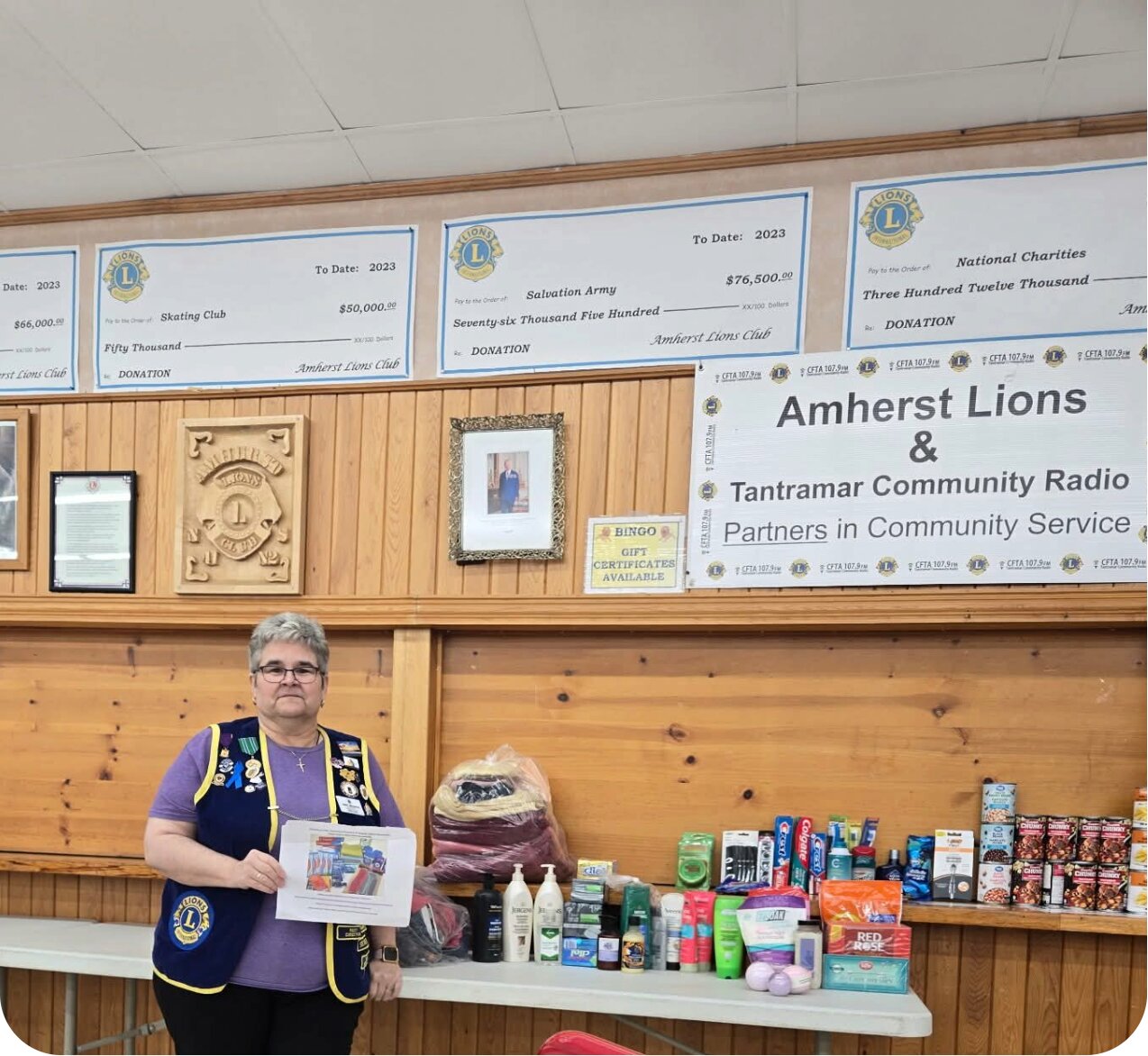 During the month of February the Amherst Lions Club collected items for the Cumberland Homelessness and Housing Support Association. Here Lion Cheryl MacKenzie shows some of the items collected.