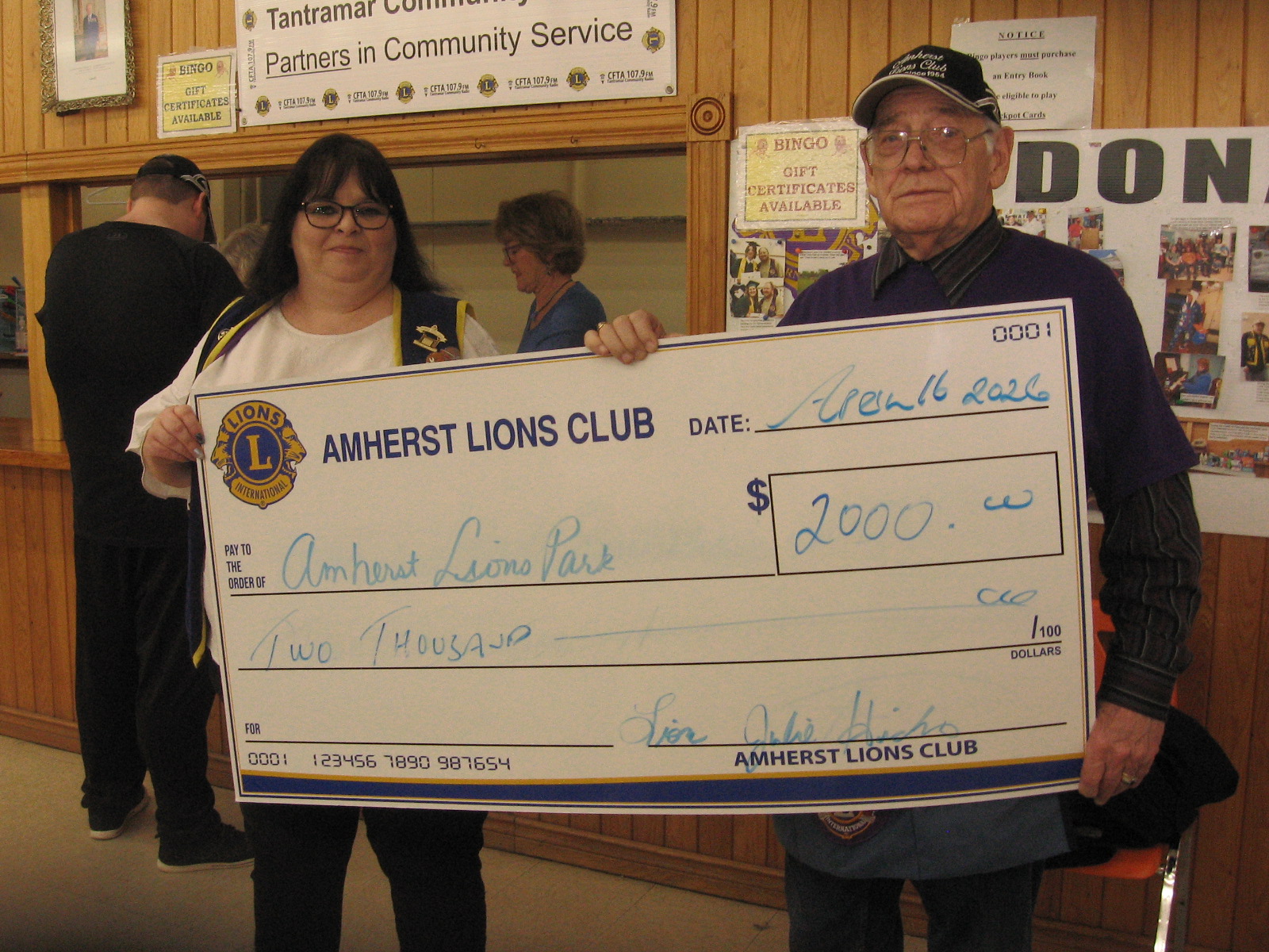 During a special merchandise bingo the Amherst Lions Club raised funds in support of their Lions Park. Here Lion Julie Hicks chair of the bingo presents a cheque to Lion Rubin Millard, chair of the park committee.