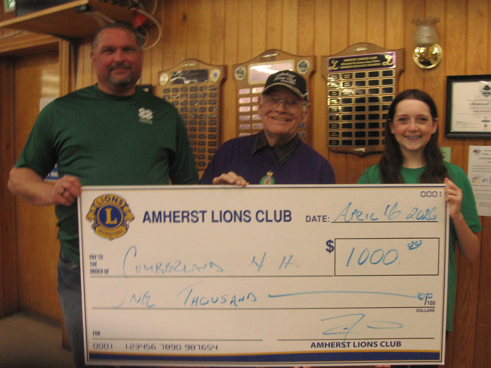 The Amherst Lions Club supported the Cumberland County 4H with a cheque. Here Lion Rubin Millard presents the cheque to Michael Coffin and Charlotte Robinson from the 4H.