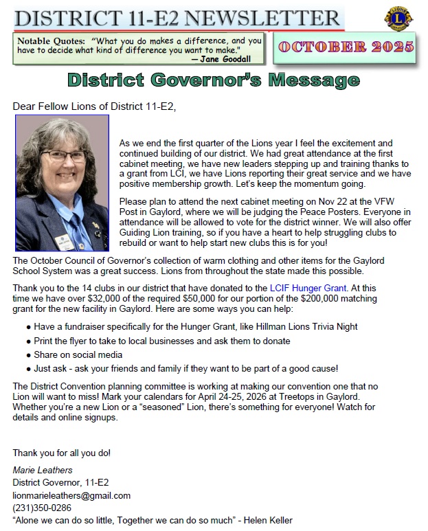 Lions District 11-E2 consists of 26 clubs in Alcona, Alpena, Antrim, Arenac, Charlevoix, Cheboygan, Crawford, Emmet, Gladwin, Iosco, Kalkaska, Montmorency, Ogemaw, Oscoda, Otsego, Presque Isle and Roscommon counties in the northern lower peninsula of Michigan.