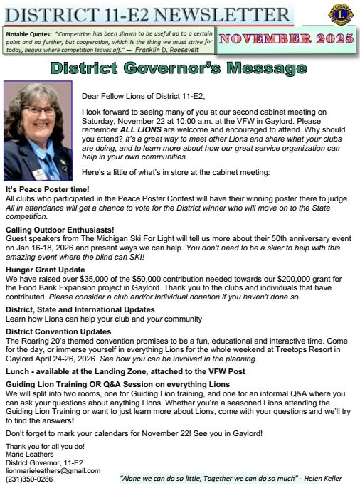 Lions District 11-E2 consists of 26 clubs in Alcona, Alpena, Antrim, Arenac, Charlevoix, Cheboygan, Crawford, Emmet, Gladwin, Iosco, Kalkaska, Montmorency, Ogemaw, Oscoda, Otsego, Presque Isle and Roscommon counties in the northern lower peninsula of Michigan.
