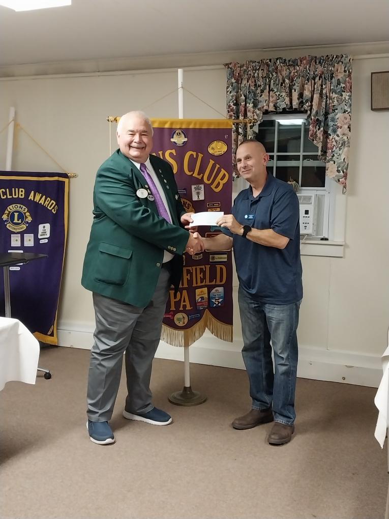 Plainfield Lions Club President Scott presents a check from the club to DG Doug for his district projects.