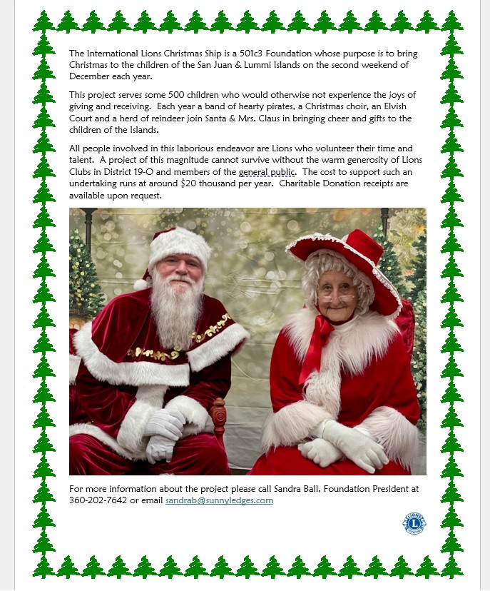 International Lions Christmas Ship - this Project is now in full swing as the Pirates, Elves, Choir, Critters and Santa & Mrs Claus prepare for their annual voyage!