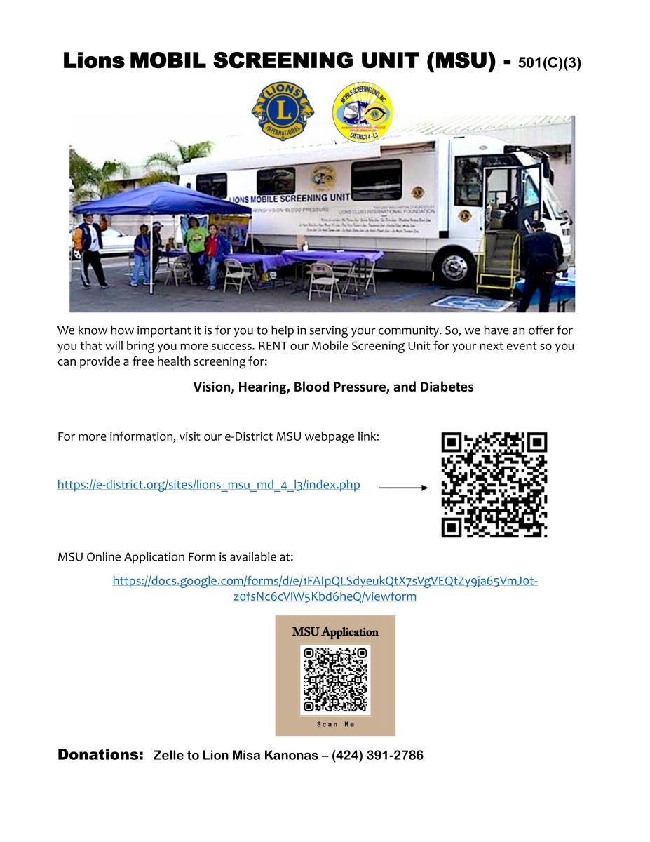 The Mobile Screening Unit, Inc. was established as a District project in 1984 under the leadership of DG Kay Izuka. Its origins go back to 1970 when a converted school bus called "The Eye Mobile" was operated in District 4-L1.