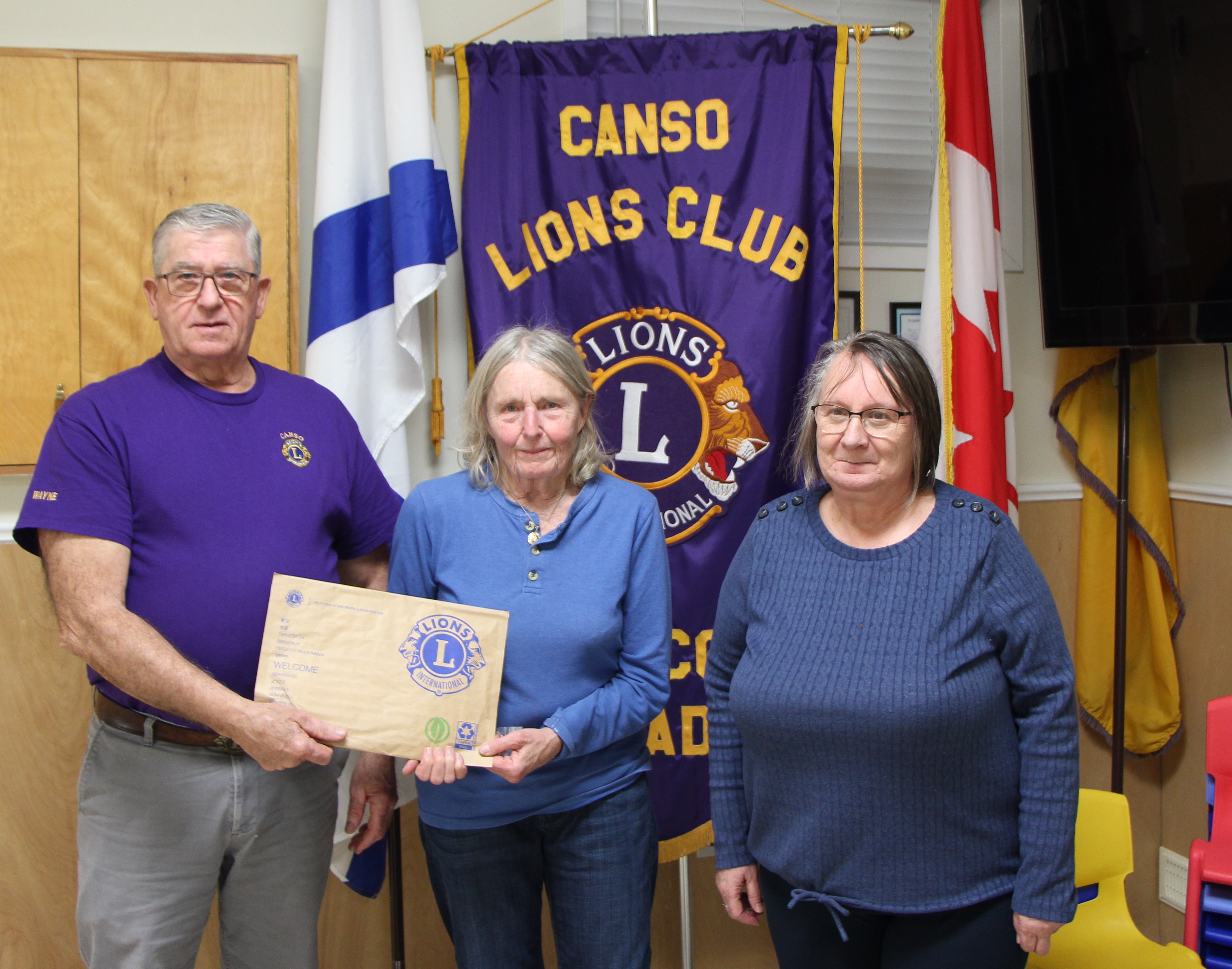 Canso Lions Club King Lion Wayne Sullivan with new member Lion Marlene Irwin and her sponsoring Lion Janet Delorey.