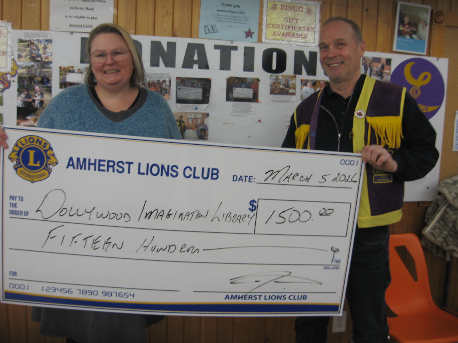 The Amherst Lions Club made a donation to the Dolly Parton Imagination Library. The funds will put books in the hands of approx. 35 children in Cumberland County for a year.