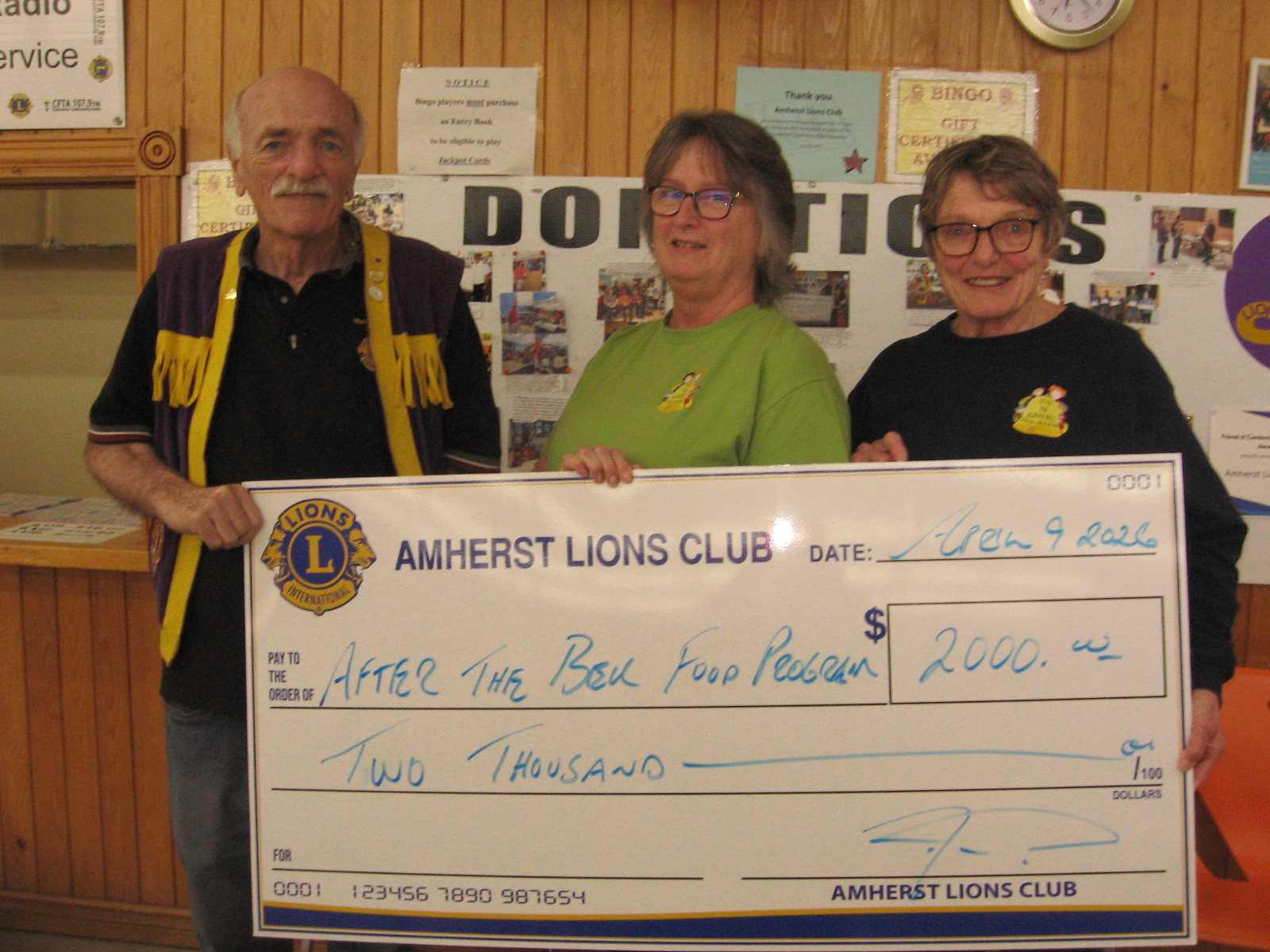 Lion Fred Broughton of the Amherst Lions Club presents a cheque to Dorothy Chase and Lynda Fenton of the After the Bell program.