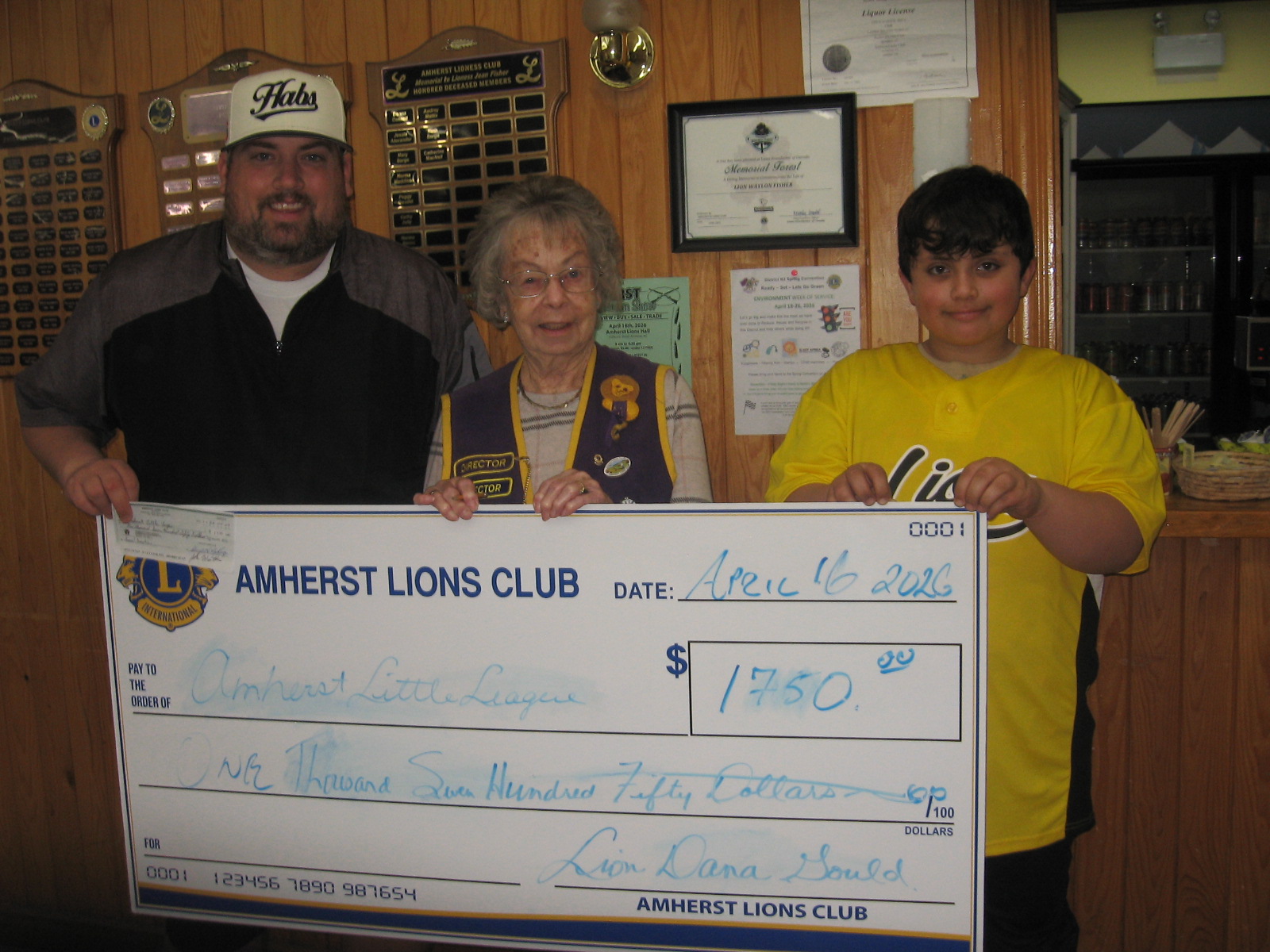 The Amherst Lions Club made a donation to the Amherst Little League. Here Andrew Gilroy and his son Ben accept the cheque from Lion Jean Cameron.
