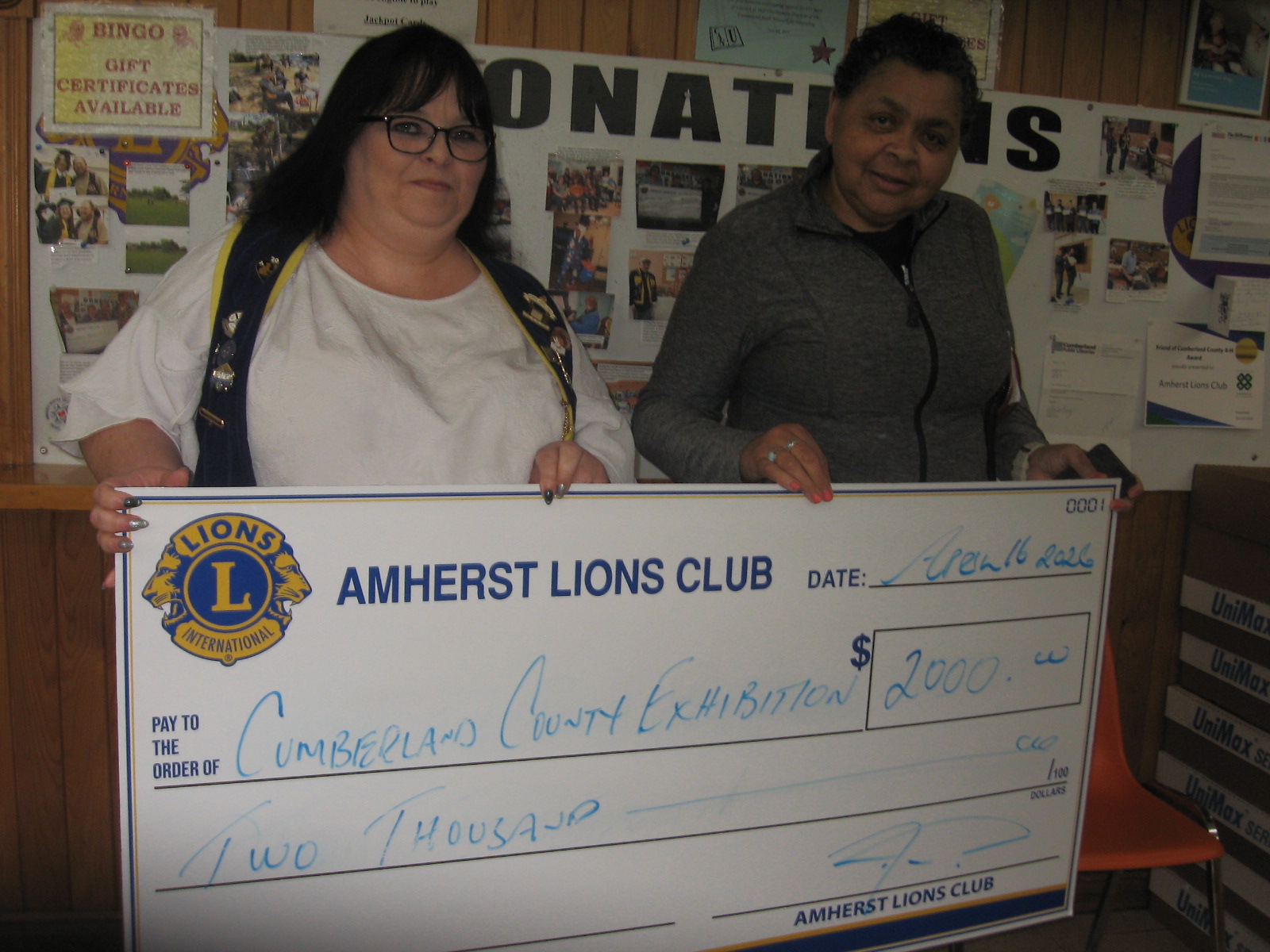 The Amherst Lions Club recently made a donation to the Cumberland Exhibition. Here Lion Julie Hicks presents the cheque to Holly Martin from the Exhibition committee.